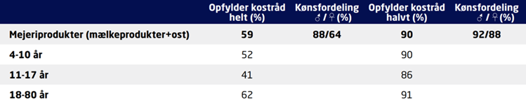 På tværs af aldersgrupperne viser data desuden, at 59 % af befolkningen samlet set opfylder kostrådene for mejeriprodukter. Der er dog tydelige forskelle mellem grupperne: